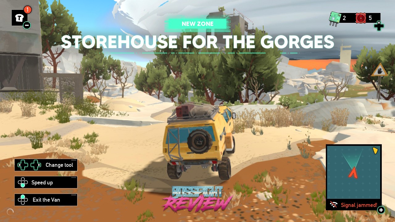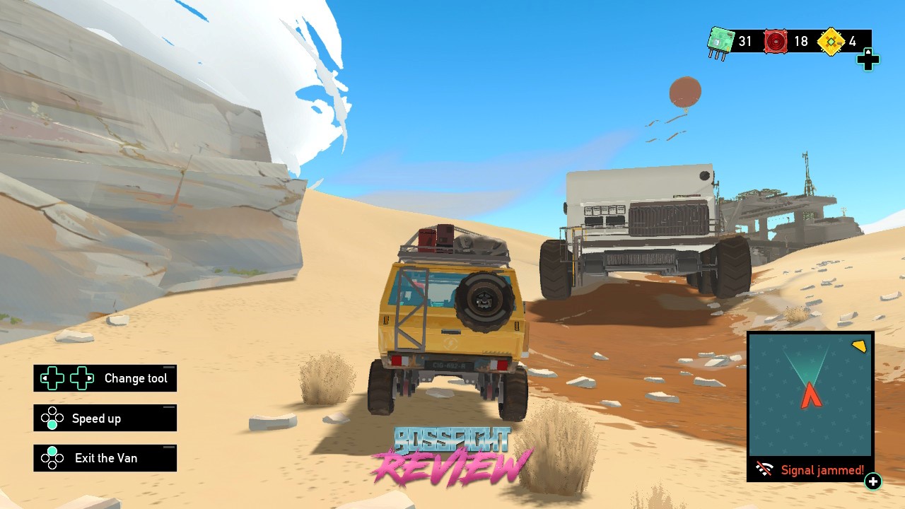 Όσον αφορά το όχημα μας λοιπόν, πρόκειται και για τον βασικό μηχανισμό του παιχνιδιού, αφού η βασική πρόοδος γίνεται μέσω αυτού. Όσο προχωρά το παιχνίδι και συλλέγουμε αρκετά κομμάτια ώστε να μπορούμε να το αναβαθμίσουμε, ξεκλειδώνουμε ιδιότητες όπως το scan το hook ή το σκάψιμο, που κάνουν τη ζωή μας τρομερά πιο εύκολη. Κάθε νέα ιδιότητα που ξεκλειδώνουμε, μοιάζει σαν τεράστια πρόοδος, μιας και ανακαλύπτουμε πράγματα που είτε ήταν κρυμμένα είτε κάπου μη προσβάσιμα, ανακαλύπτοντας έτσι καινούριες τοποθεσίες και κατ’ επέκταση περιπέτειες. Κάτι που κάνει τη ζωή μας επίσης πολύ πιο εύκολη στο παιχνίδι, είναι ότι σε όποιο σημείο κι αν βρισκόμαστε, όσο μακριά κι αν είμαστε από το αμάξι, με το πάτημα ενός κουμπιού μπορούμε να τηλεμεταφερθούμε σχεδόν αμέσως σε εκείνο. Όσο αφορά την αίσθηση του στην οδήγηση, δεν μπορώ να πω ότι είναι συναρπαστική, αλλά σαν όχημα πιο πολύ χρειάζεται να μας μεταφέρει απλά στο επιθυμητό σημείο, χωρίς να χρειάζεται να δοκιμάσει τις οδηγικές μας ικανότητες. Επίσης κάτι που πρέπει να αναφερθεί, όχι απαραίτητα σαν αρνητικό, είναι ότι ούτε το αμάξι, ούτε και η Sauge δέχονται ζημιά, ακόμα και αν πέσουν από τον πιο ψηλό γκρεμό. Επειδή δεν εξηγείται με κάποιο τρόπο ότι κατέχει υπερδυνάμεις ή τεχνολογίες, θα προτιμούσα να έχει εισαχθεί κάτι ώστε να το δικαιολογεί, αλλά καταλαβαίνω ότι είναι το ύφος του παιχνιδιού τέτοιο, που σε αφήνει σε απόλυτη ελευθερία και χωρίς κανένα άγχος.