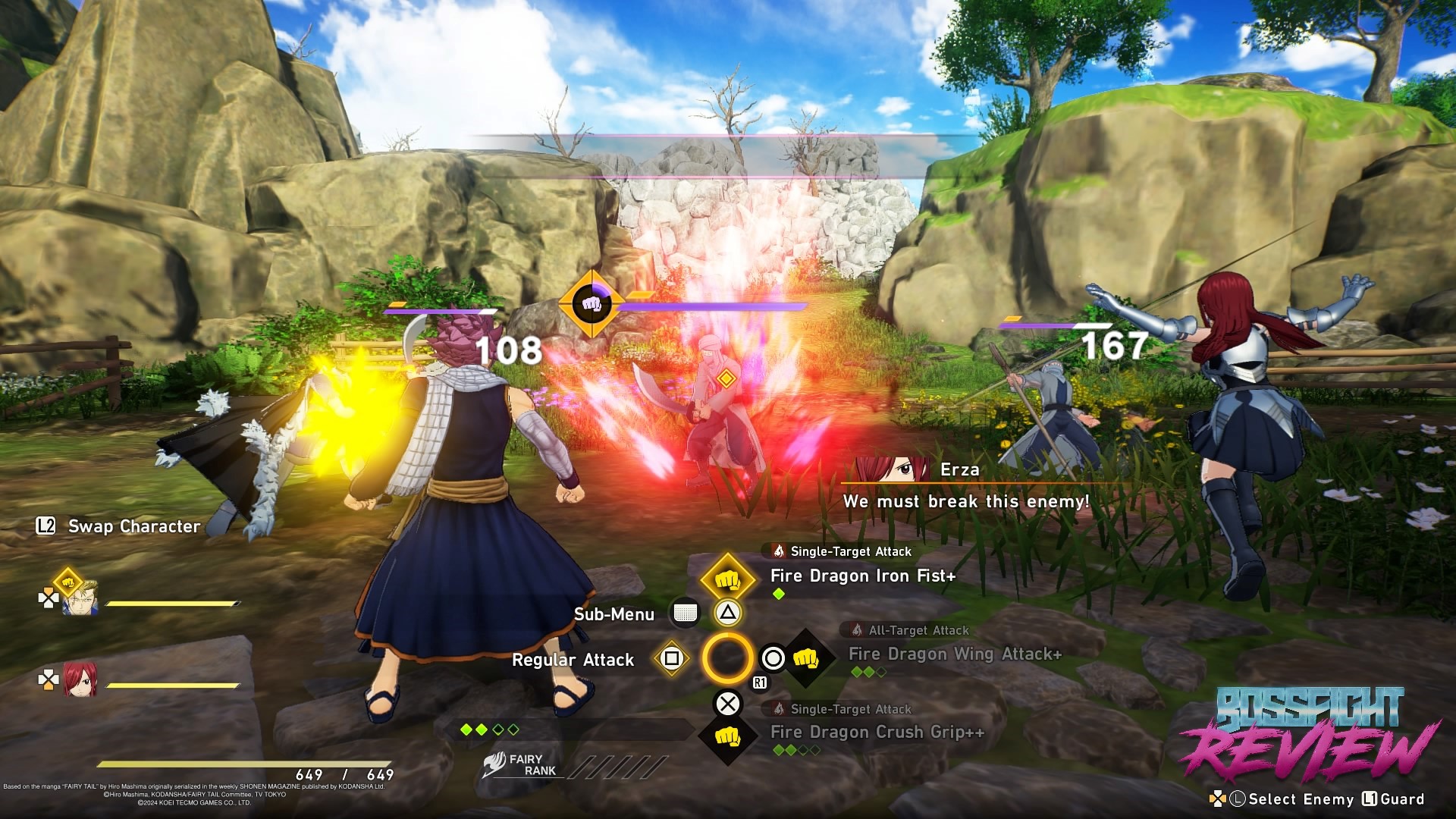 Όσον αφορά το gameplay του τώρα, το Fairy Tail 2 είναι ένα ιδιαίτερο είδος turn-based RPG. Αυτό που το κάνει ιδιαίτερο είναι ότι οι μάχες δε γίνονται περιμένοντας τη σειρά του ο κάθε χαρακτήρας για να παίξει, αλλά περιμένοντας να φορτώσει μια μπάρα. Όσοι έχουν παίξει το αρχικό παιχνίδι δε χρειάζονται συστάσεις. Για τους υπόλοιπους θα έφερνα αρχικά το παράδειγμα της σειράς Xenoblade. Προχωρώντας στον χάρτη με τον χαρακτήρα της αρεσκείας μας, υπάρχουν διάσπαρτες ομάδες εχθρών που μπορούμε να ξεκινήσουμε μάχη χτυπώντας πρώτοι. Στη μάχη, ο κάθε χαρακτήρας έχει τα δικά του μοναδικά skills και χαρακτηριστικά τα οποία αναβαθμίζονται σε μορφή skill tree. Ένα απλό combo επίθεσης μας γεμίζει το stamina που χρειαζόμαστε για να κάνουμε τα skills αυτά. Το combo επίθεσης όμως έχει cooldown το οποίο εξαρτάται από το πόσο γρήγορος είναι κάθε χαρακτήρας. Στην αρχή ίσως κατακλυζόμαστε από ορολογίες και κανόνες καθώς εμπλουτίζεται περεταίρω με συνδυαστικές επιθέσεις, support επιθέσεις και τελικές επιθέσεις, αλλά το παιχνίδι κάνει καλά τη δουλειά του στο να μας εξηγεί και να μας εισάγει ομαλά στους μηχανισμούς του.