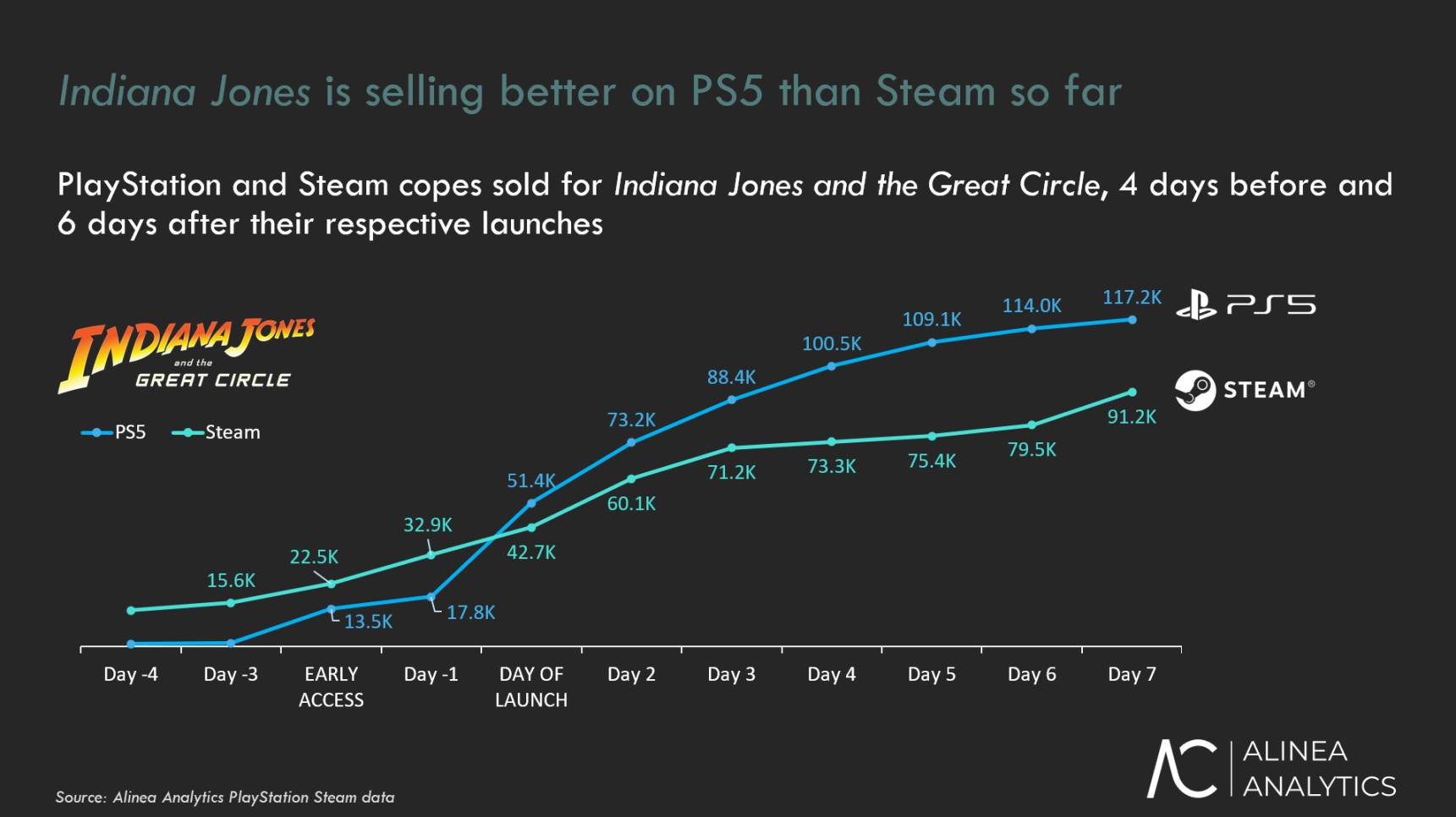 Σύμφωνα με αναφορά από την ιστοσελίδα Alinea Analytics, το Indiana Jones and the Great Circle της ομάδας ανάπτυξης MachineGames έχει πουλήσει 117.2 χιλιάδες αντίτυπα στο PS5 κατά τις πρώτες έξι ημέρες κυκλοφορίας του, δηλαδή από τις 17 έως τις 23 Απριλίου. Στην πλατφόρμα Steam, οι συνολικές πωλήσεις του τίτλου ξεπέρασαν τις 310 χιλιάδες από την κυκλοφορία του τον περασμένο Δεκέμβριο μέχρι και σήμερα ενώ σύμφωνα με τις εκτιμήσεις της Alinea, οι πωλήσεις στο PlayStation 5 αναμένεται να αυξηθούν και άλλο.